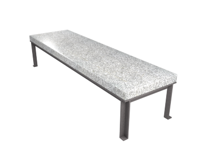 Banco de 55x42x190 cm, con asiento de pórfido patagónico y cuerpo estructural de perfiles de acero con protección antioxidante y pintura de color negro, colocación con taco químico, arandela y tornillo.