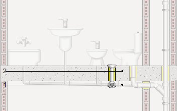 Bote sifónico de PVC, de 110 mm de diámetro, con tapa ciega de acero inoxidable, colocado superficialmente bajo la losa. | ||
