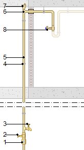 Montante de 12 m de longitud, colocado superficialmente y fijado al paramento, formado por tubo de polietileno reticulado (PE-Xa), serie 5, modelo Aqua Pipe "UPONOR IBERIA", de 20 mm de diámetro exterior, PN=6 atm y 1,9 mm de espesor, sistema de unión Quick and Easy, suministrado en rollos; purgador automático de aire de latón y llave de paso de esfera, con maneta vista de acero inoxidable. Incluso material auxiliar para montaje y sujeción a la obra, accesorios y piezas especiales. | ||